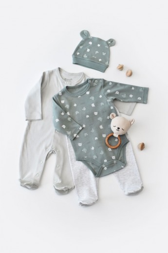 Σετ βρεφικών ρούχων της εταιρείας Biorganic. Φτιαγμένο από άριστης ποιότητας υλικά με οργανικό βαμβάκι εγγυάται άνεση και ασφάλεια για το ευαίσθητο δέρμα του μωρού σας. Το σετ περιλαμβάνει: Μπλούζα με κουμπάκια| Σκουφάκι | Παντελονακί με κλειστό πόδι | Κορμάκι με μακρύ μανίκι- Σύνθεση: 100% Οργανικό..