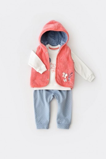 Σετ βρεφικών ρούχων της εταιρείας Biorganic. Άνετο, ευκολοφόρετο και κυρίος ασφαλές με το βρεφικό δερματάκι χάρης στο οργανικό βαμβάκι. Το σετ περιλαμβάνει, μπλούζα με σχέδιο, παντελονάκι και ζακέτα αμάνικη με κουκούλα, μικρή επένδυση και φλις εξωτερικό.- Χρώμα μπλούζας: Εκρού- Χρώμα παντελονιού: Σι..