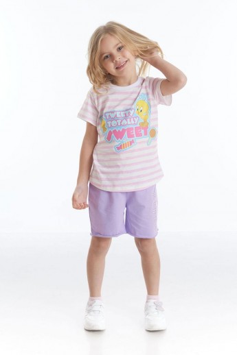 Πιτζάμα παιδική με τον Tweety. Κοντομάνικη μπλούζα με σορτσάκι.- Χρώμα μπλούζας: Ροζ - λευκό ριγέ- Χρώμα σορτς: Λιλά- Σύνθεση: 100% Βαμβάκι..